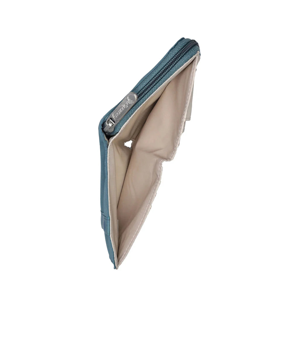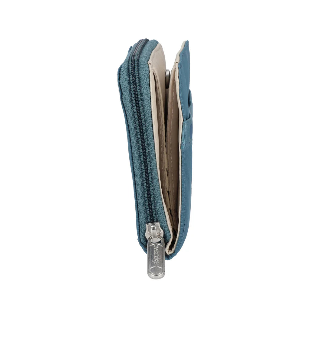 Features a full-length bill compartment with snap closure, Zip closure coin compartment with interior center divider pocket, Exterior front open pocket, 8 interior credit card slots