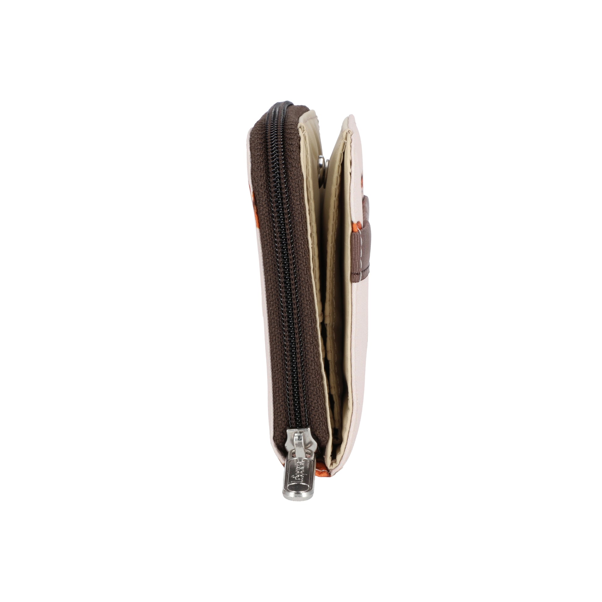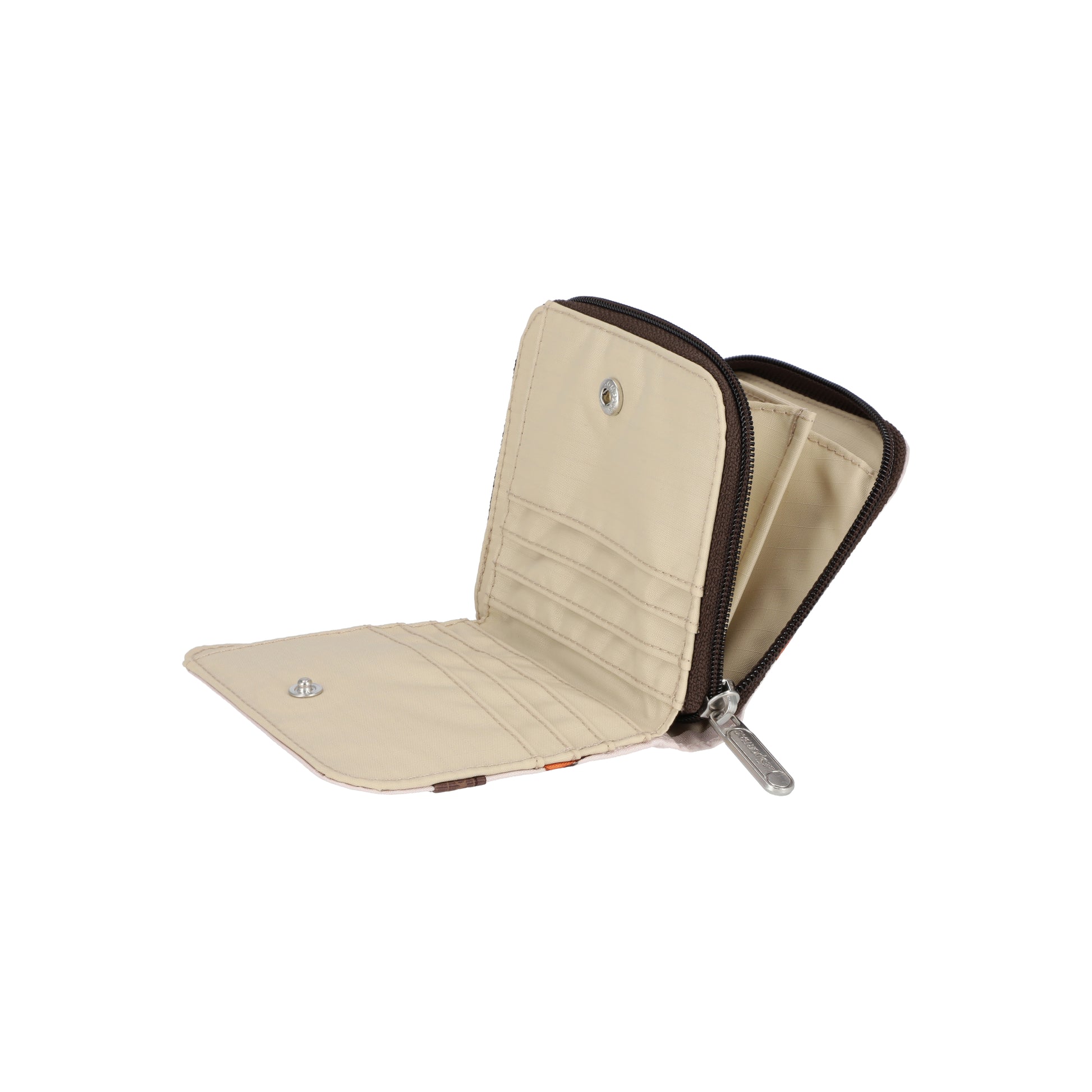 Features a full-length bill compartment with snap closure, Zip closure coin compartment with interior center divider pocket, Exterior front open pocket, 8 interior credit card slots