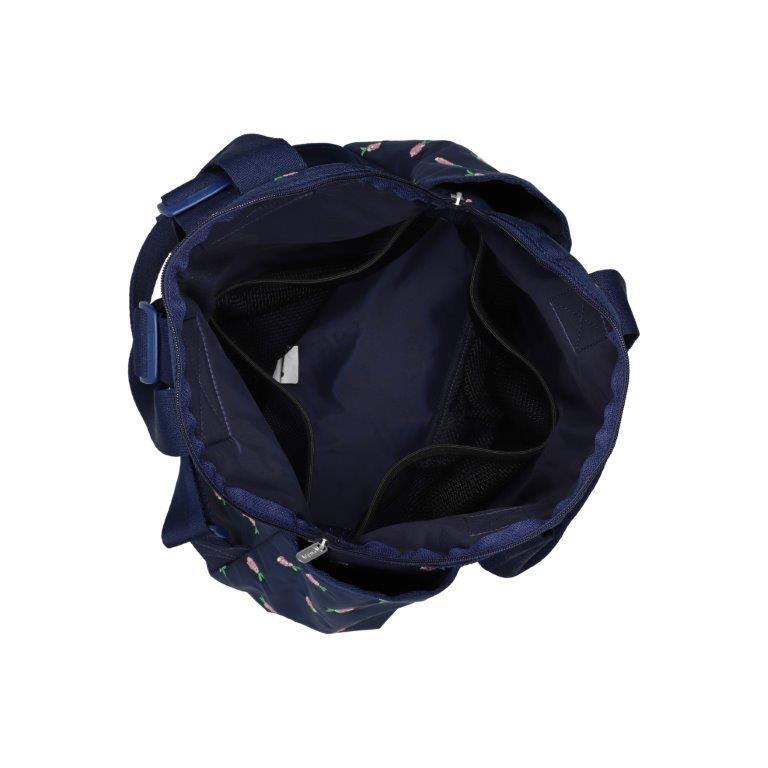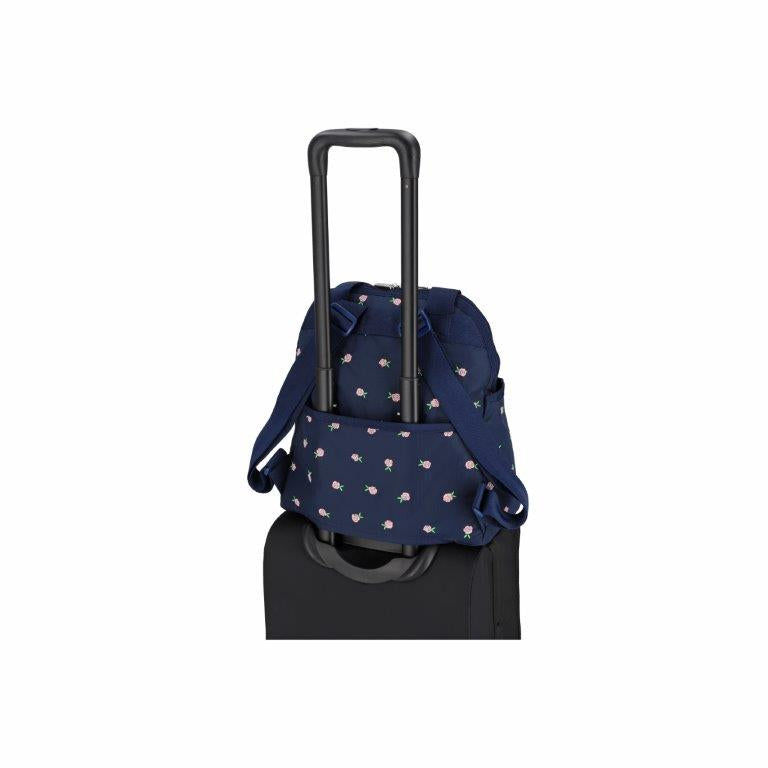 Zip top main closure with dual zipper pulls, Pinched top handles with a 6.5in (16.51cm) drop, Exterior front pocket with zip closure, Exterior front open pocket (behind zipper pocket), Two exterior side open top pockets, Exterior back panel zip closure pocket with dual zipper pulls at top and a bottom zipper (to convert pocket into a sleeve to slide over rolling luggage handles), Adjustable shoulder straps, Two interior front wall open mesh pocket, Two interior back wall open mesh pocket, Plastic hardware