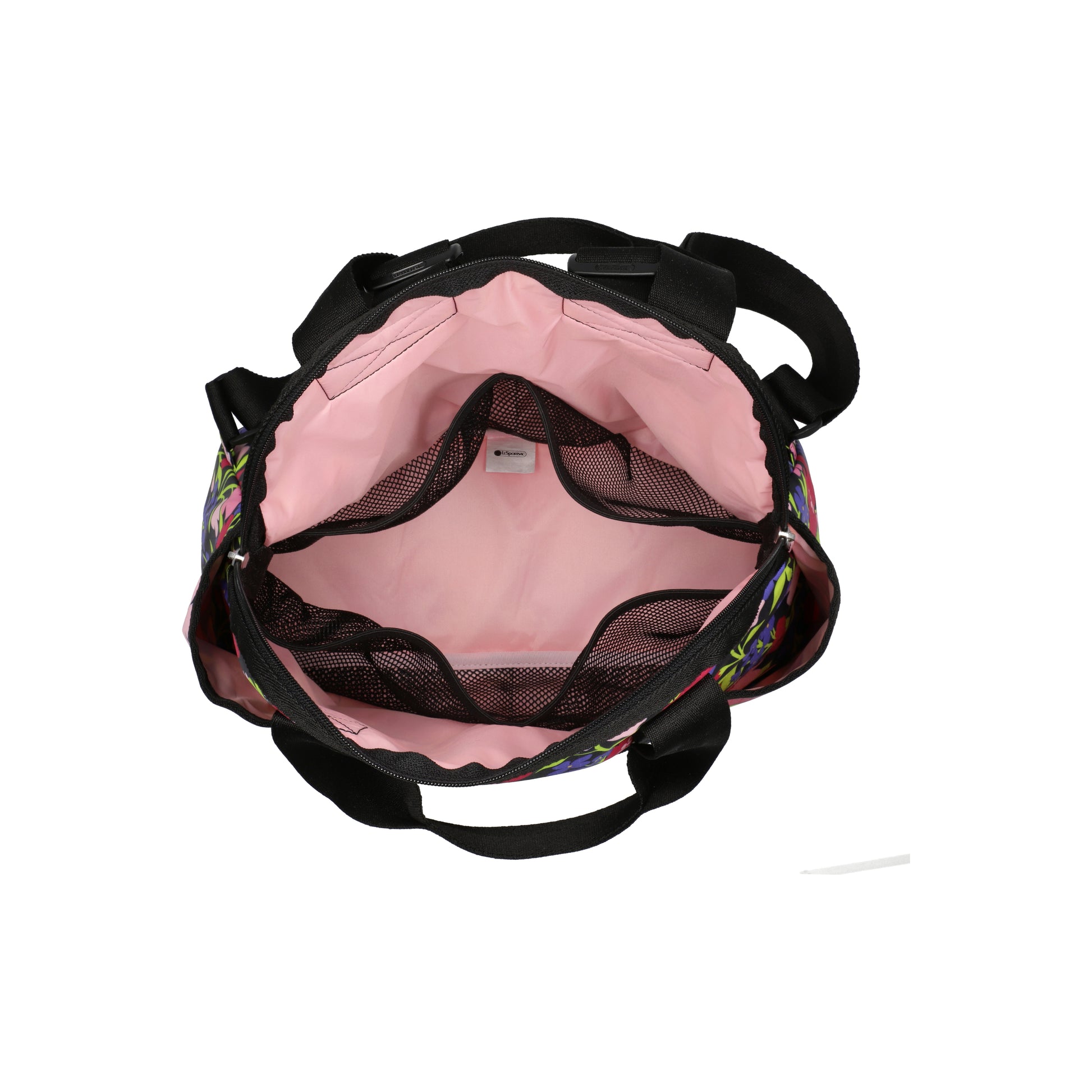 Zip top main closure with dual zipper pulls, Pinched top handles with a 6.5in (16.51cm) drop, Exterior front pocket with zip closure, Exterior front open pocket (behind zipper pocket), Two exterior side open top pockets, Exterior back panel zip closure pocket with dual zipper pulls at top and a bottom zipper (to convert pocket into a sleeve to slide over rolling luggage handles), Adjustable shoulder straps, Two interior front wall open mesh pocket, Two interior back wall open mesh pocket, Plastic hardware